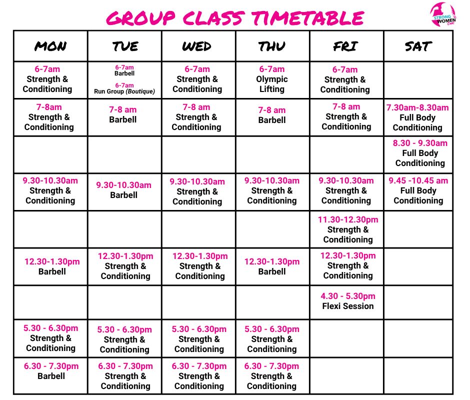 Working out alongside other people on the same health and fitness journey provides the additional support, motivation and inspiration you need to achieve your goals. Our strength sessions are kept between 2 and 8 members. This allows us to maintain high training standards, ensure proper technique and adjust programs for individuals in case of any injury or other circumstances.